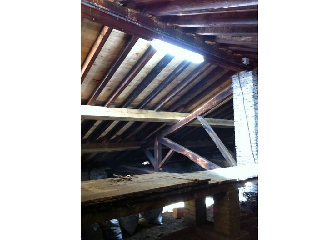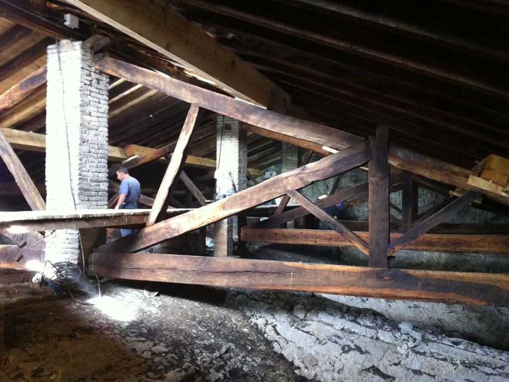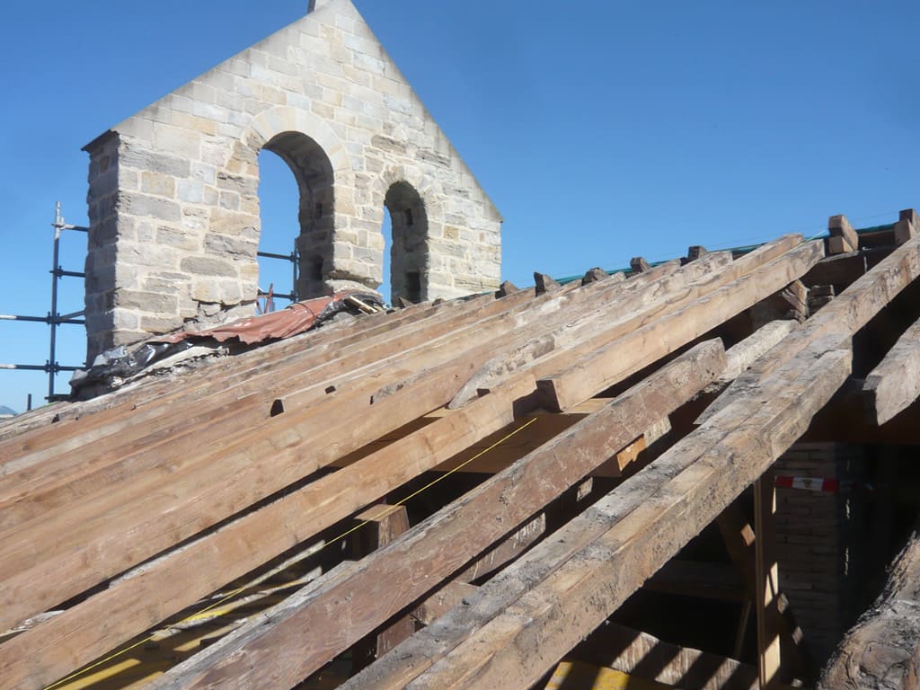 La estructura de madera, un entramado de cerchas, correas y cabios, se encontraba muy bien conservada y se mantuvo. Sólo hizo falta sustituir un par de correas por otras de similares características.