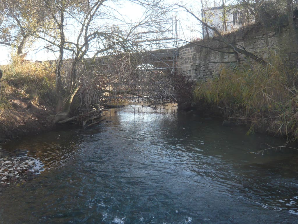 Aguas arriba, los estribos presentan un derrame o abocinado para favorecer la conducción del agua hacia el ojo. La fábrica del tímpano de la margen derecha se prolonga casi 7 metros para contención del terreno, mientras que el lado opuesto es mucho menos largo. Aguas abajo arco y tímpanos son coplanarios.