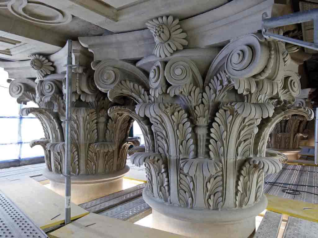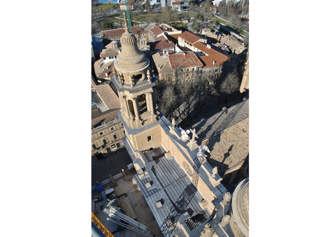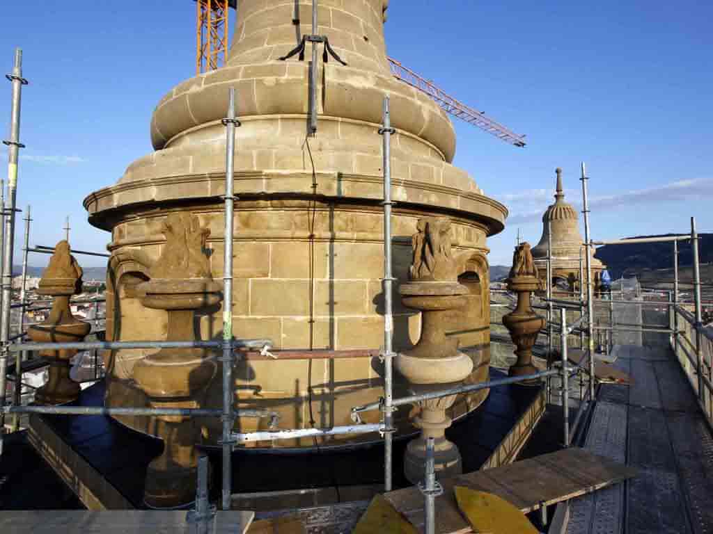 Los elementos escultóricos como los flameros se encontraban muy deteriorados y presentaban serios problemas de estabilidad. La sustitución de estos elementos pétreos, principalmente decorativos, ha sido grande. Los criterios para sustituir estas piezas no han sido meramente estéticos sino constructivos. Todas las piezas que corrían el riesgo de desprenderse han sido sustituidas.