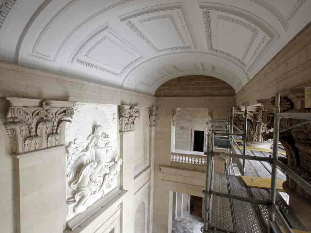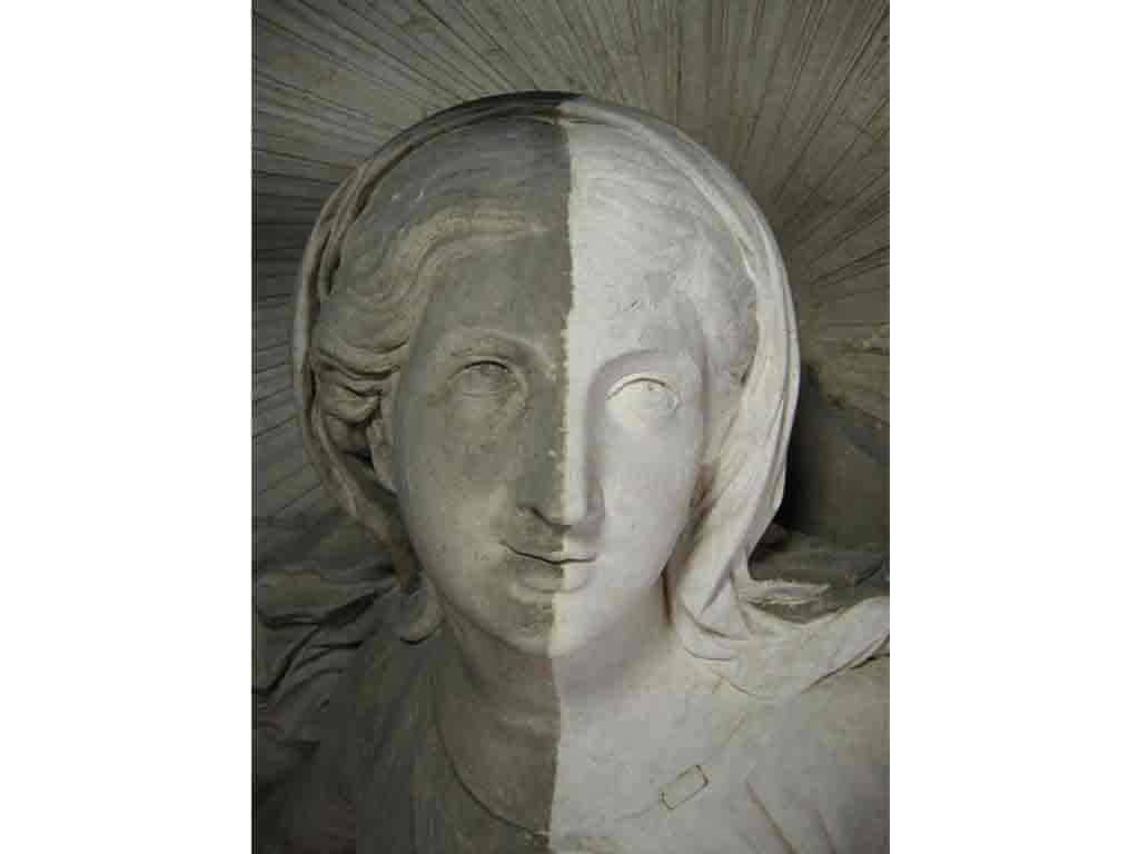 Los paramentos lisos se han limpiado con agua precalentada desionizada atomizada. El relieve de la Asunción, que presentaba grandes acumulaciones de polvo, se limpió con láser. Los elementos decorativos como los capiteles fueron limpiados principalmente con microproyección de esferas de vidrio.