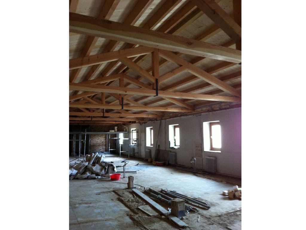 La intervención de sustitución de cubierta ha supuesto el desmonte completo de la cubierta existente. Se propone la sustitución de la estructura por una nueva de cerchas, correas y tabla en madera de abeto Douglas, que evite la existencia de pilares en el interior, pues la Propiedad desconoce el uso que pueda darle en un futuro.