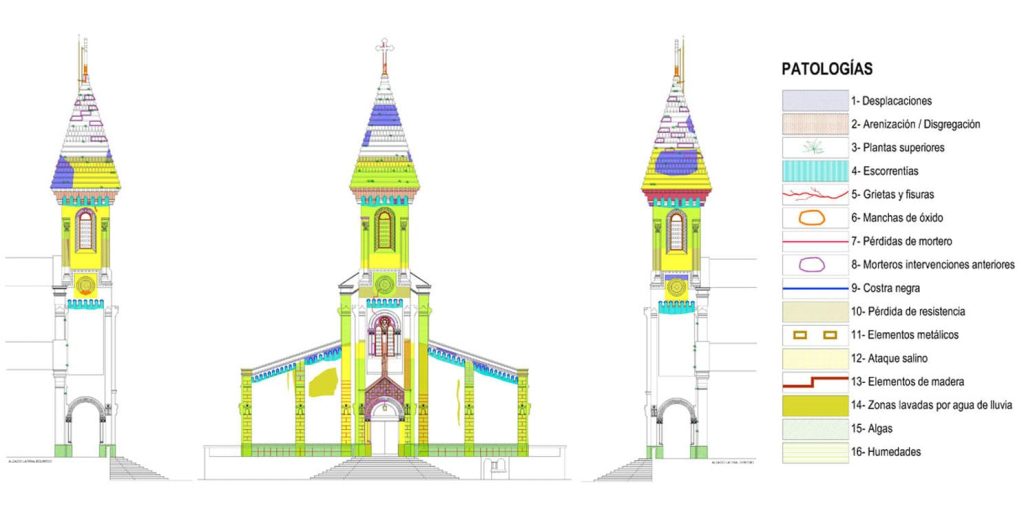 Antes de acometer el proyecto fue necesario realizar un análisis de patologías, centrado principalmente en el ataque salino que sufre la torre. Fue realizado por el Dr. José Mª García de Miguel.
