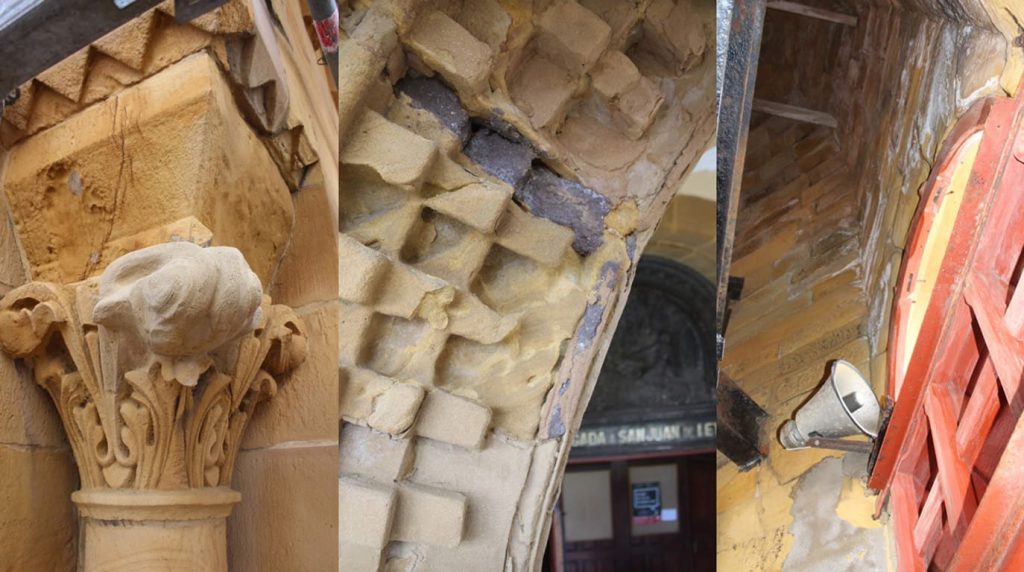 La fachada que nos ocupa ha sufrido dos restauraciones que podamos observar, con diferentes resultados. Ninguna de ellas ha ido al origen del problema, sino sólo a reparar los daños ocasionados, por lo que las patologías siguen presentes y los procesos de deterioro siguen existiendo. Han sido soluciones a corto plazo y de manera inmediata, sin embargo lo que el monumento necesita es ir al origen del problema y solucionarlo, si no todas las intervenciones no serán más que parches, en los que luego haga falta volver a intervenir.