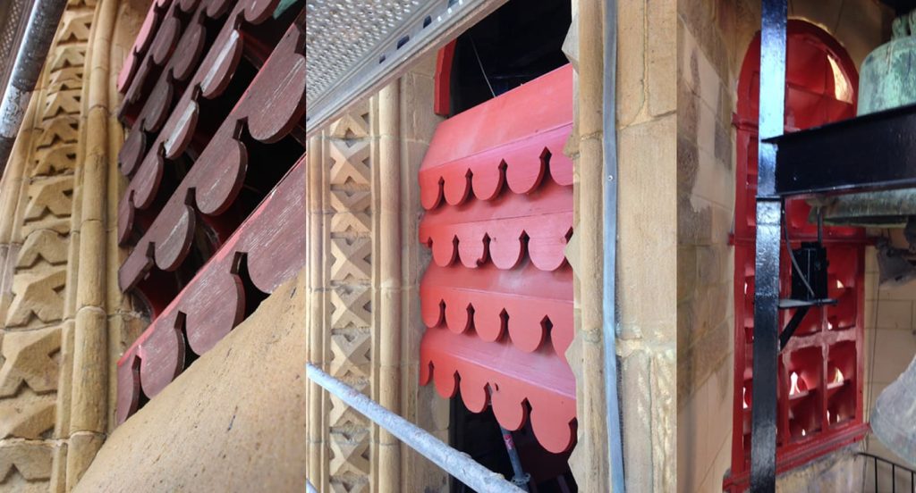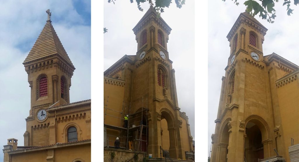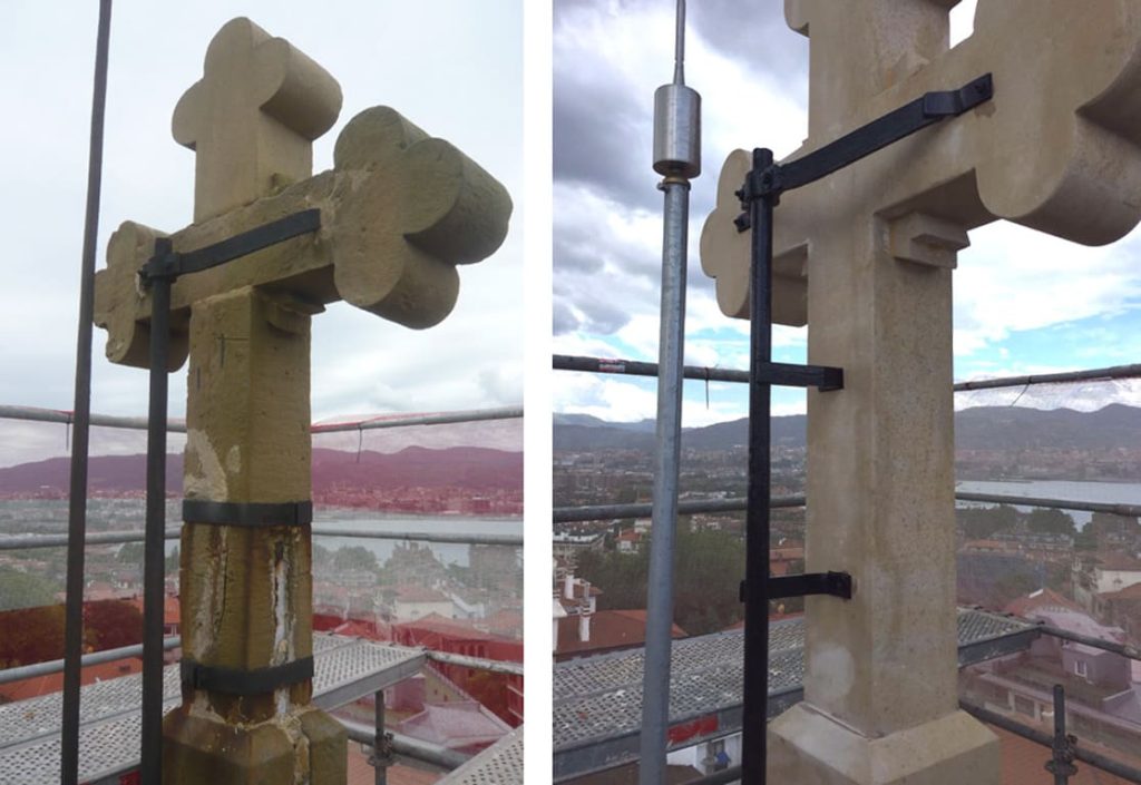 Las piezas metálicas oxidadas son tratadas: Se pasiva la oxidación y se revisan los anclajes. Las pérdidas de material pétreo y de rejuntado en las cornisas llevan consigo la aparición de manchas de escorrentía. Para solucionar este problema se propone reperaltar las cornisas dañadas con mortero de reparación armado con varillas de acero inoxidable. Esta solución nos permite garantizar el correcto y homogéneo discurrir del agua de las cornisas, evitando que se quede estancada. Además por su composición y color es una intervención que queda perfectamente integrada en la fachada y que pasa totalmente desapercibida. Lo último que se hace se será hidrogufar aquellas partes que todavía no hayan sido intervenidas. El producto hidrofugante, es con polisiloxanos, es decir, repelentes del agua que evitan la entrada del agua desde el exterior pero que permiten que la piedra pueda transpirar.